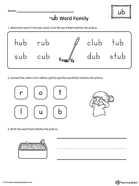 Use the UB Word Family List to practice reading rhyming words that end in -UB. The list includes simple CVC and CCVC words to help young children practice blending letter sounds.