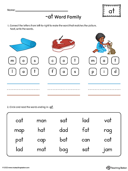 Use the AT Word Family Read and Spell worksheet to help children read and spell words with a similar pattern. Students will practice phonic skills and writing CVC words ending in -...